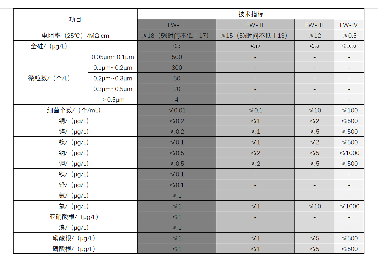 电子级水分为四个级别:Ⅰ级、Ⅱ级、Ⅲ级、Ⅳ级。