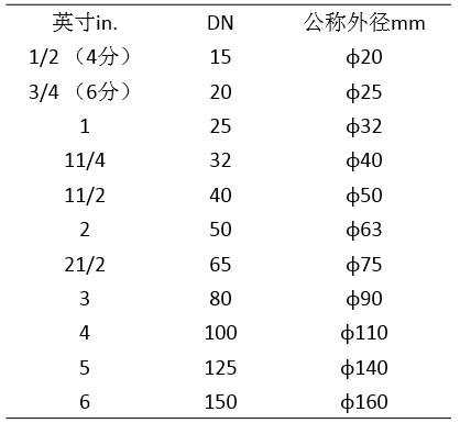 各管材公称直径和外径对照表